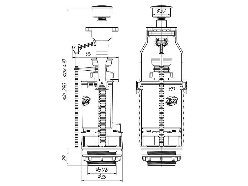 Регулировка высоты в диапазоне 290-410 мм позволяет адаптировать механизм под разные модели бачков.