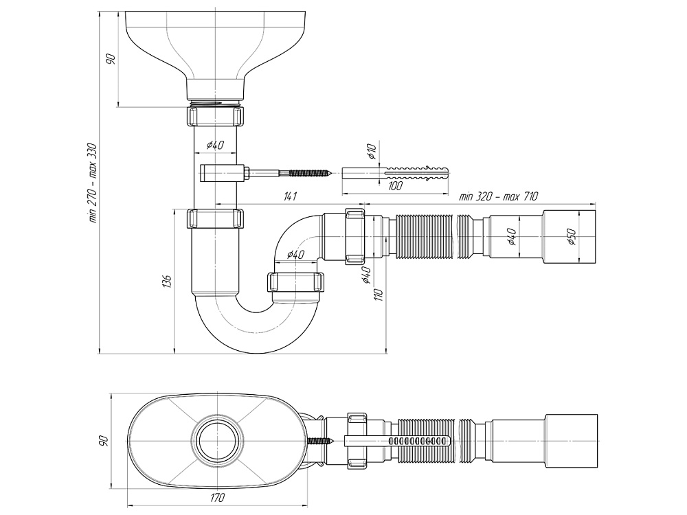Сифон АНИ Пласт DR0115 1 1/2 дюйма 40 мм с разрывом струи с гибкой трубой 40х40/50 мм