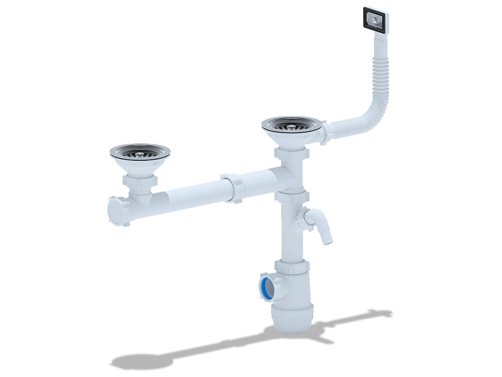 Двойной одноуровневый слив обеспечивает эффективное удаление воды из обеих чаш мойки одновременно, что особенно удобно для больших кухонь.