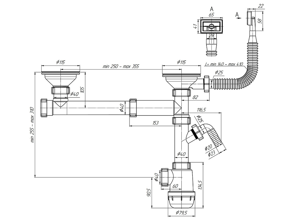 Cифон для мойки АНИ Пласт Грот A7500S 3 1/2 дюйма 40 мм двойной смещенный с переливом и отводом для стиральной машины