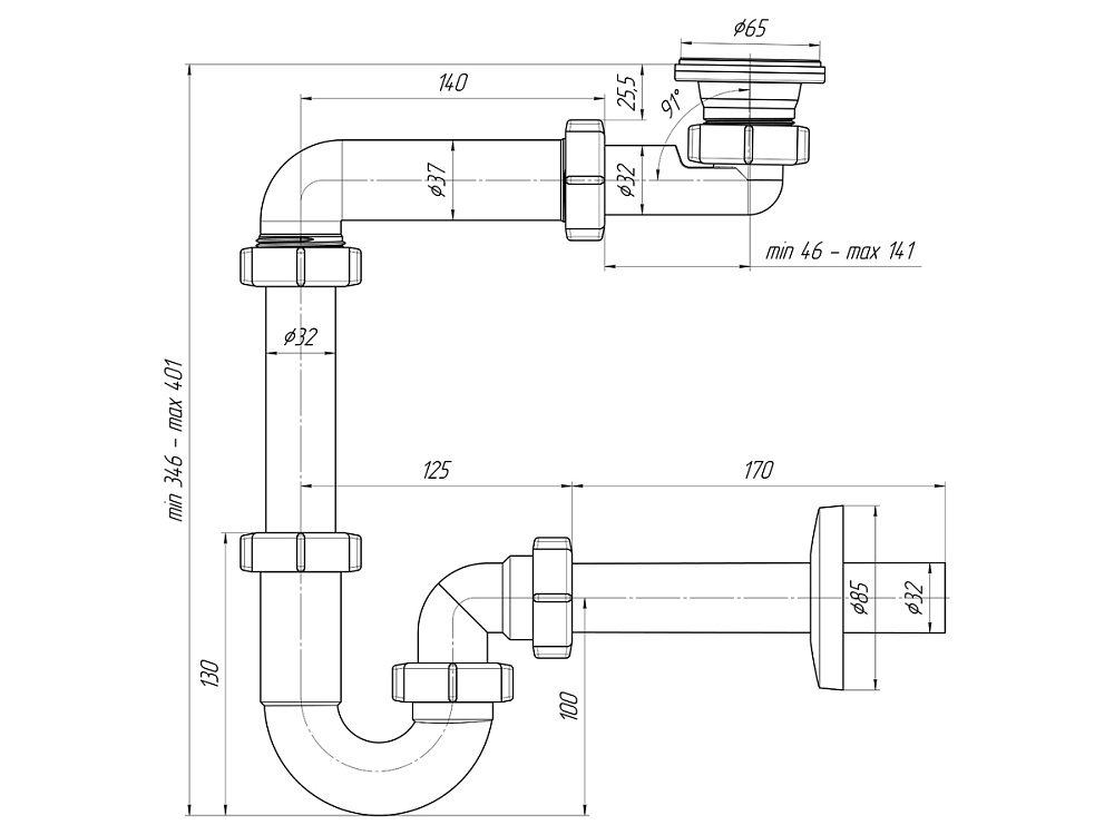 Изготавливаемый из пластика, данный сантехнический сифон позволяет легко подгонять все патрубки под индивидуальные условия установки, что обеспечивает простоту монтажа.