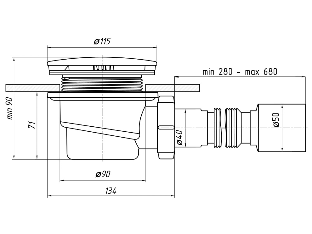 Сифон для душевого поддона АНИ Пласт E325C 1 1/2 дюйма 90 мм высота 65 мм хром с гибкой трубой 40х50 мм