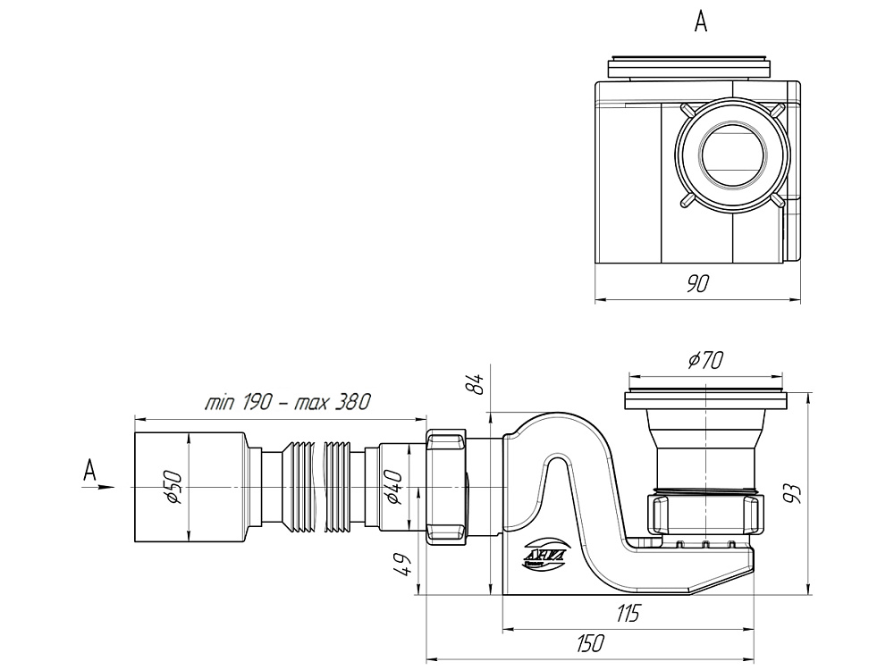 Компактная конструкция позволяет установить сифон даже в условиях ограниченного пространства под душевым поддоном.