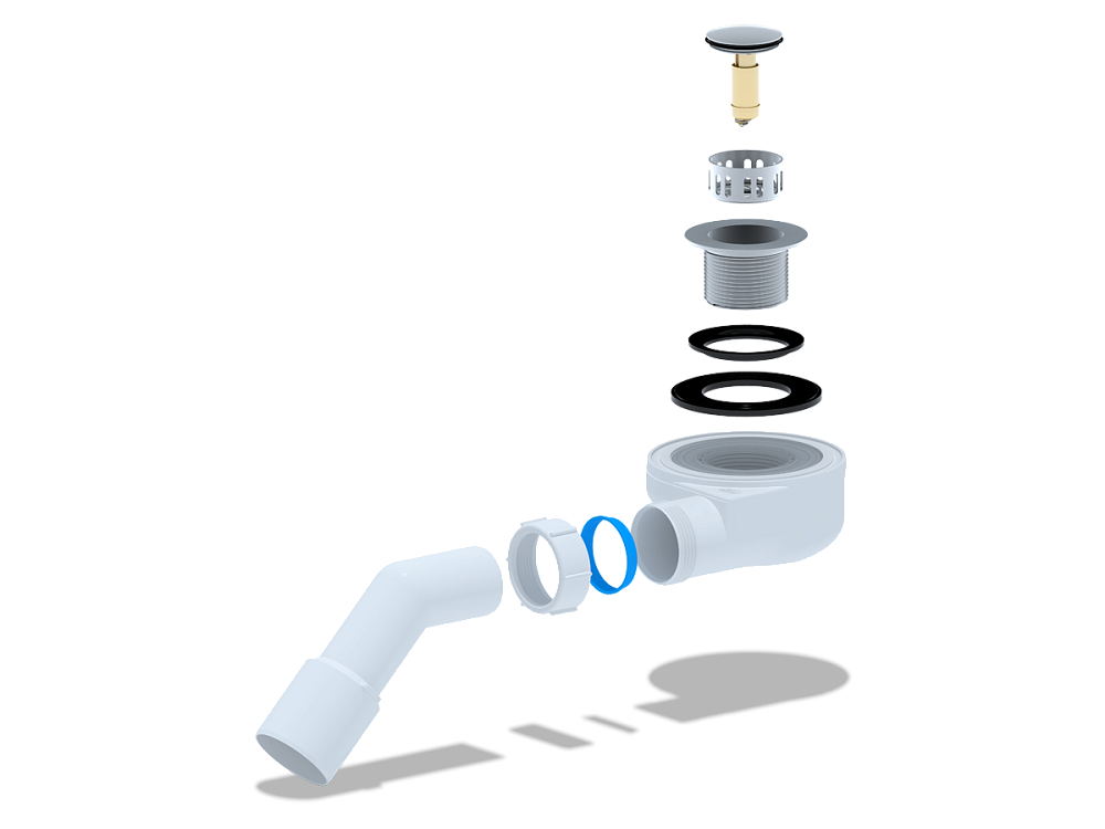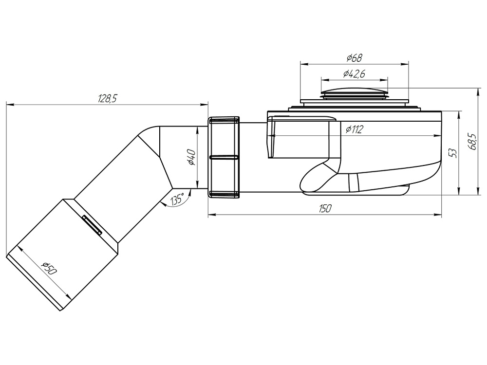 Подключение к канализации осуществляется через угловой патрубок 45° с диаметром 50/40 мм, что позволяет при необходимости без труда адаптировать систему под разные условия, просто обрезав и подготовив патрубок. -