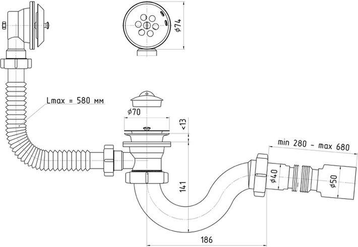 Подходит для ванн с отверстием 1 1/2" и выпуском 40 мм.