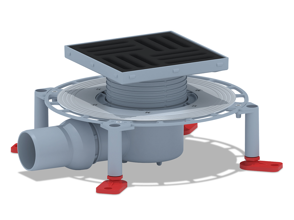 Трап TVA5616 обладает пропускной способностью 45 л/мин и высотой гидрозатвора 28 мм, что гарантирует защиту от неприятных запахов из канализации. Минимальная монтажная высота — от 75 мм, что позволяет устанавливать изделие даже в помещениях с ограниченным пространством. Корпус выполнен из пластика с широкой юбкой диаметром 250 мм для надёжной фиксации гидроизоляции, а четыре опорные ноги с регулировкой высоты обеспечивают точный монтаж по уровню. Шарнирный выпуск облегчает регулировку наклона слива воды в канализацию.