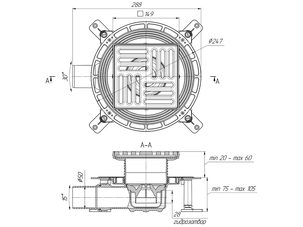 Решётка из чугуна выдерживает статическую нагрузку до 300 кг. Конструкция трапа не пропускает в сливную канализацию загрязняющие частицы, предотвращает засоры и легко чистится.