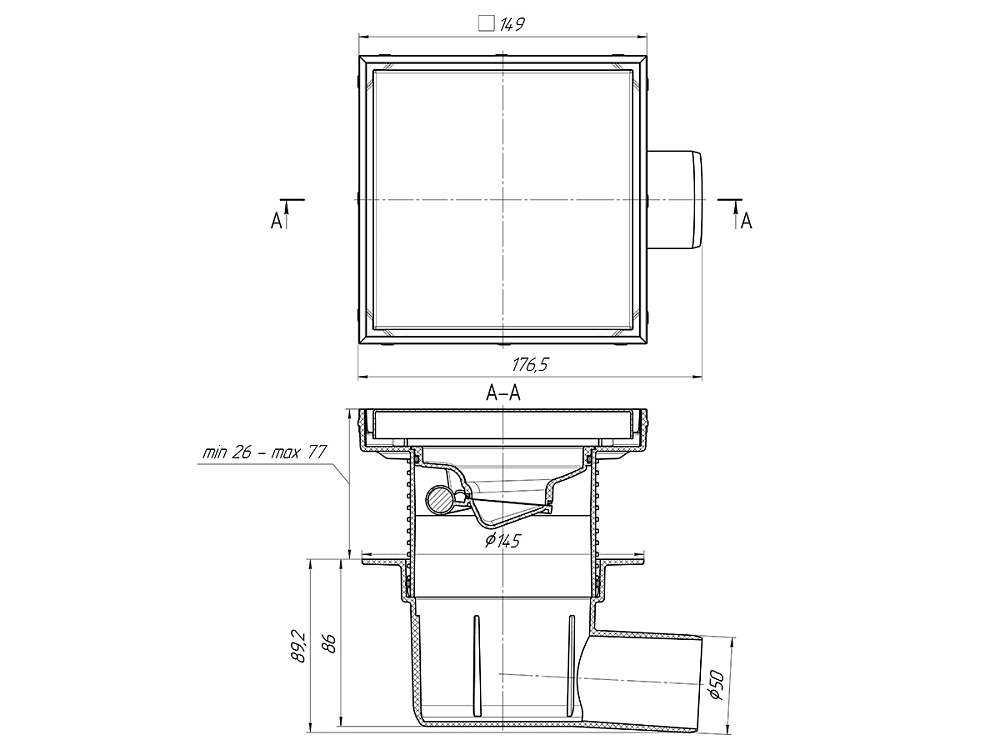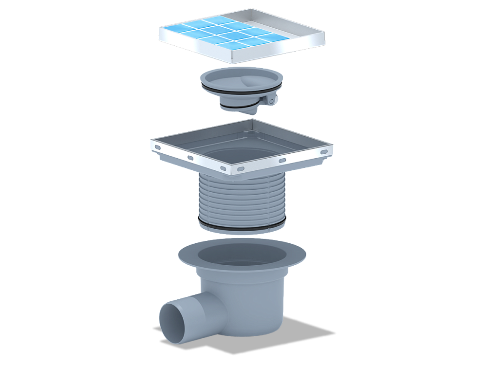Трап для душа АНИ Пласт TQ5812 DN50 горизонтальный регулируемый с сухим затвором и решёткой из нержавеющей стали 150х150 мм под плитку