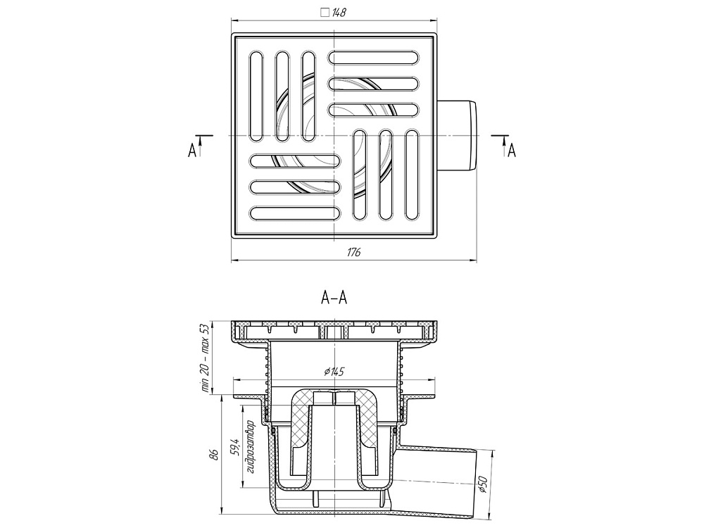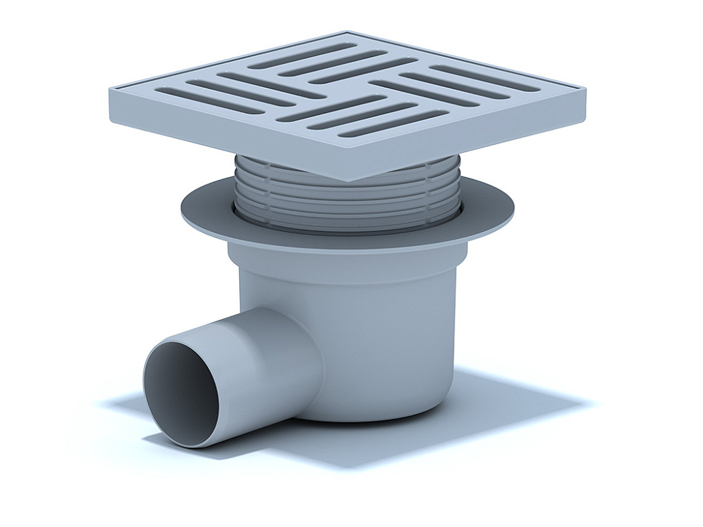 Трап горизонтальный регулируемый АНИ Пласт TA5610 выпуск 50 мм с решеткой из пластика 150х150 мм