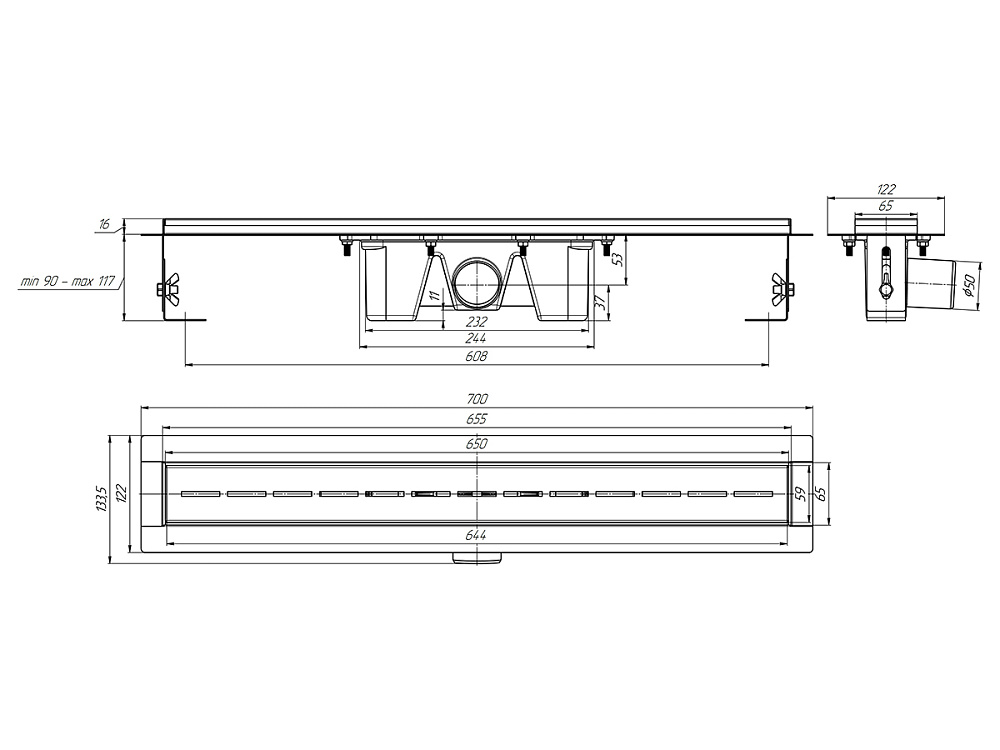 Трап линейный из нержавеющей стали АНИ Пласт TL2565G выпуск 50 мм решётка Киль глянцевая 650 мм