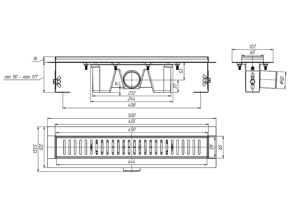 Трап линейный из нержавеющей стали АНИ Пласт TL2445G выпуск 50 мм решётка Бимс глянцевая 450 мм