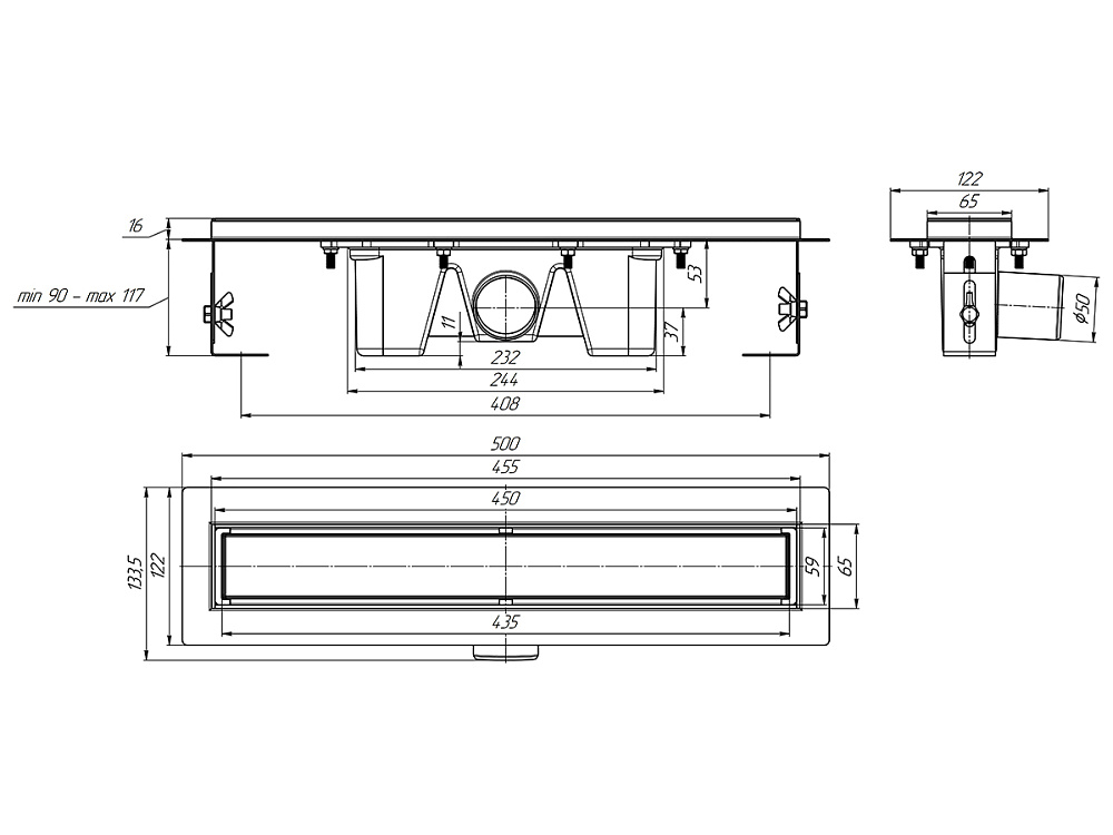 Трап линейный из нержавеющей стали АНИ Пласт TL2045 выпуск 50 мм под плитку 450 мм