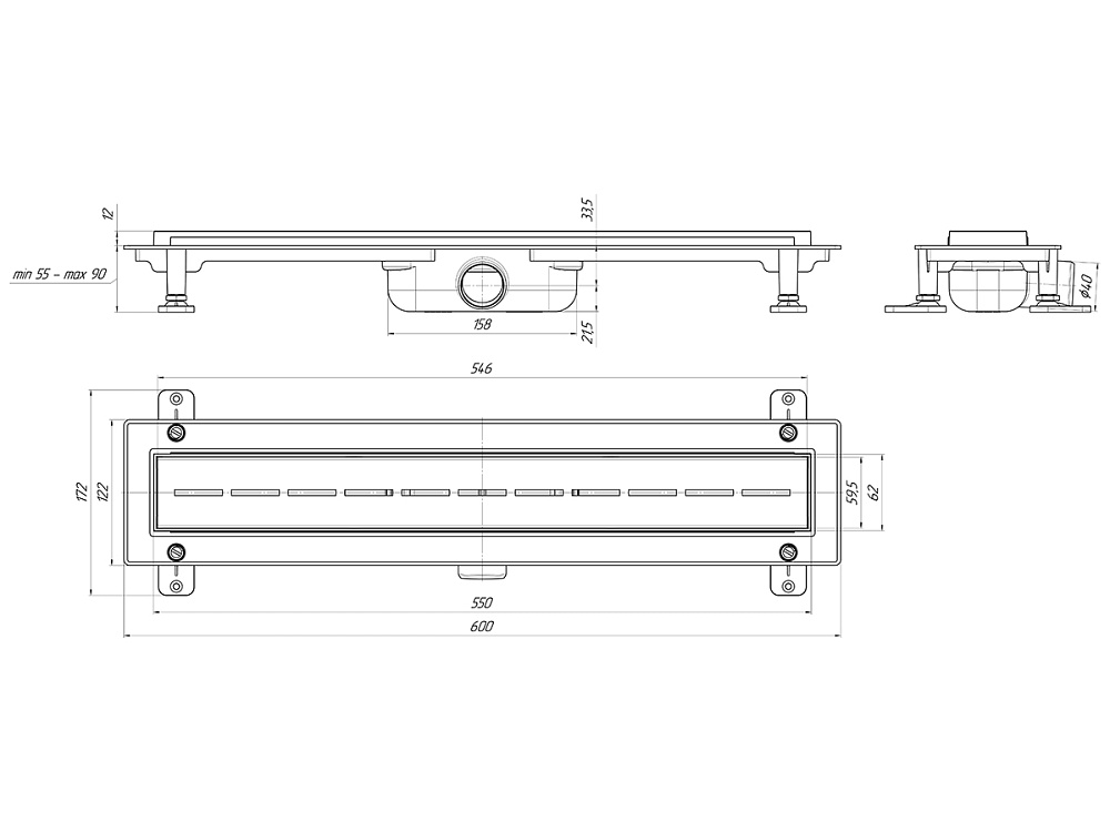 Трап линейный пластиковый АНИ Пласт TL1555M выпуск 40 мм решётка Киль матовая нержавеющая сталь 550 мм