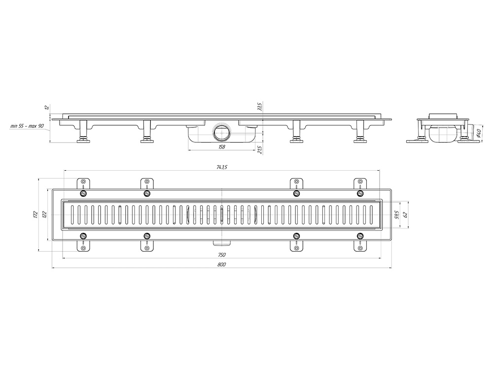 Трап линейный пластиковый АНИ Пласт TL1475G выпуск 40 мм решётка Бимс глянцевая нержавеющая сталь 750 мм