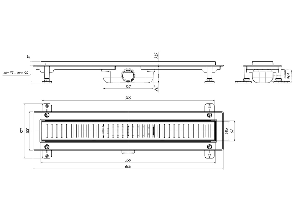 Трап линейный пластиковый АНИ Пласт TL1455M выпуск 40 мм решётка Бимс матовая нержавеющая сталь 550 мм
