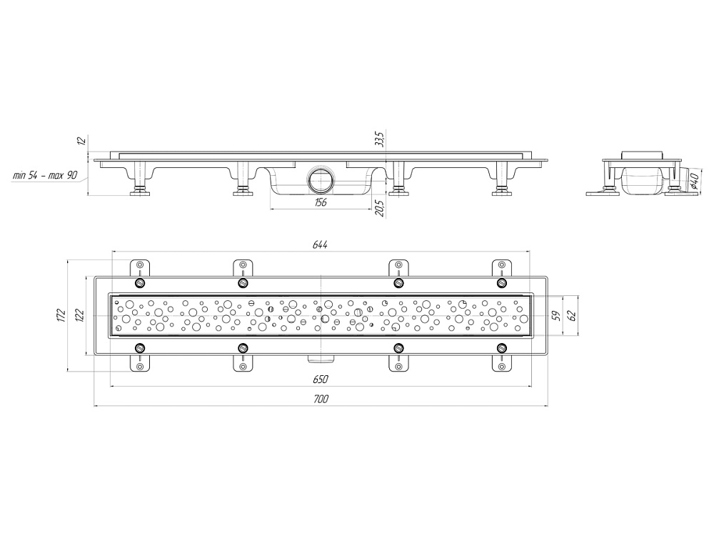 Трап линейный пластиковый АНИ Пласт TL1365M выпуск 40 мм решётка Бриз матовая нержавеющая сталь 650 мм