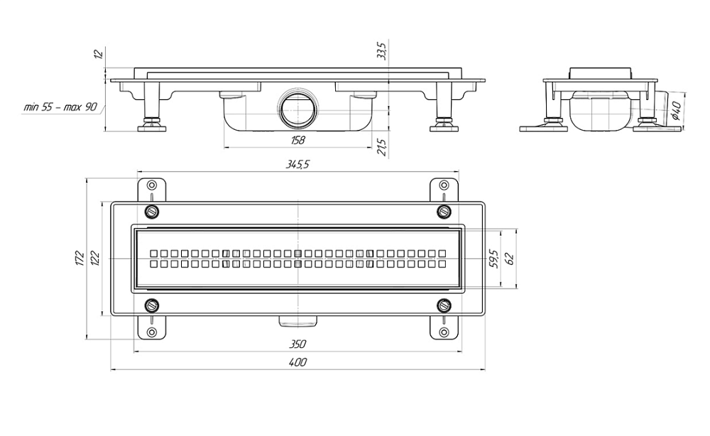 Трап линейный пластиковый АНИ Пласт TL1235M выпуск 40 мм решётка Риф матовая нержавеющая сталь 350 мм