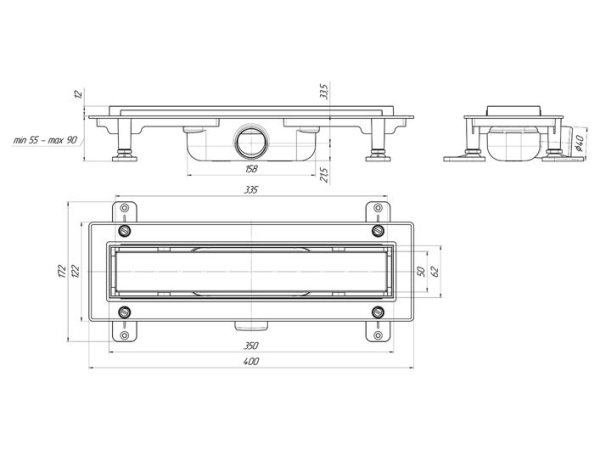 Трап линейный пластиковый АНИ Пласт TL1035 выпуск 40 мм решётка МОЛ нержавеющая сталь под плитку 350 мм