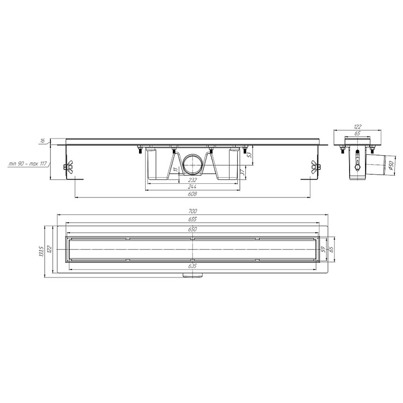 Трап линейный из нержавеющей стали АНИ Пласт TLZ2165M DN50 с комбинированным затвором матовой решёткой Штиль 450х65 мм