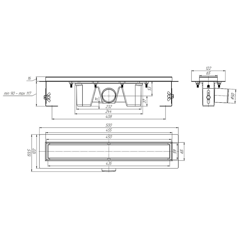 Трап линейный из нержавеющей стали АНИ Пласт TLZ2145G DN50 с комбинированным затвором глянцевой решёткой Штиль 450х65 мм