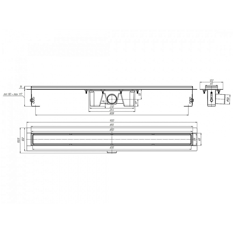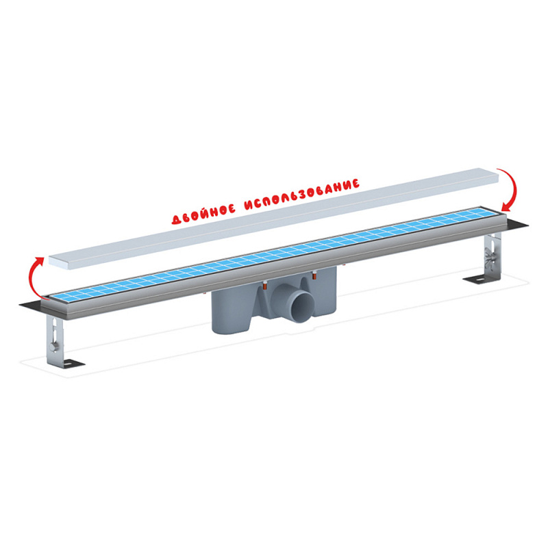 Трап линейный из нержавеющей стали АНИ Пласт TLZ2085 DN50 с комбинированным затвором матовой решёткой под плитку МОЛ 850х65 мм
