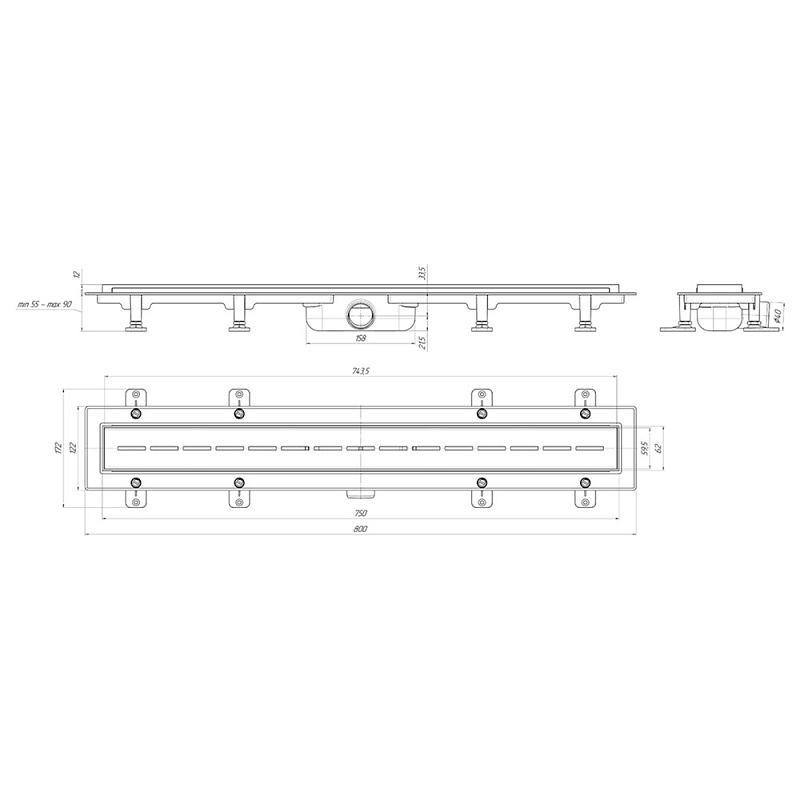 Трап линейный пластиковый АНИ Пласт TLQ1575M DN40 с сухим затвором и матовой решёткой Киль 750х62 мм