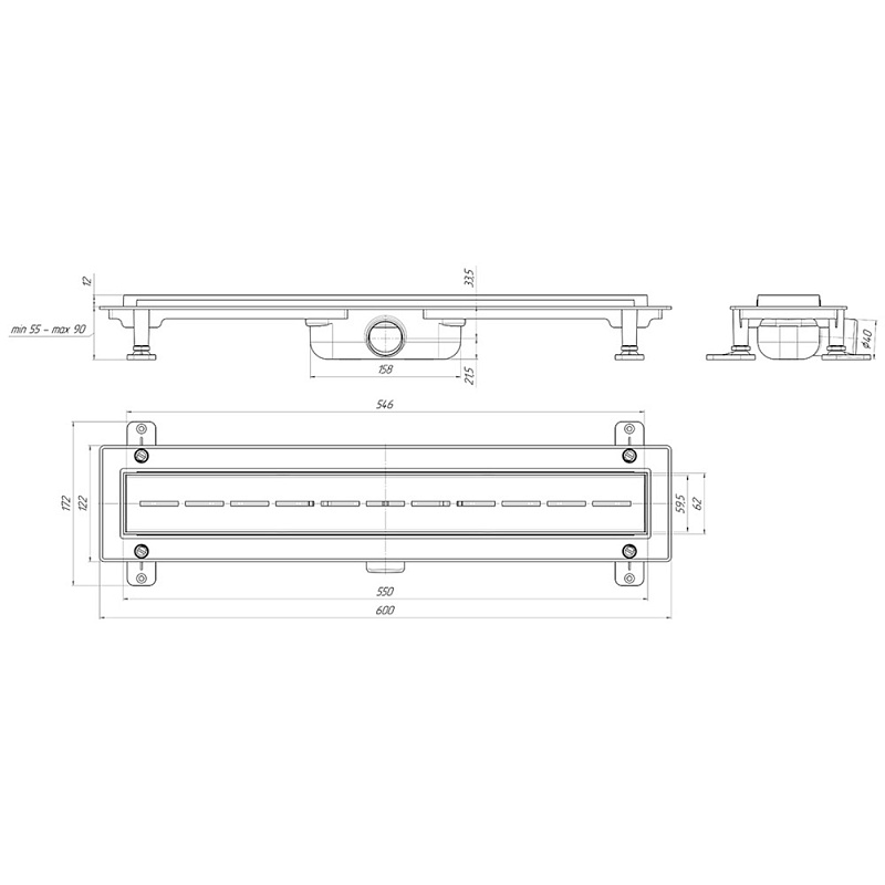 Трап линейный пластиковый АНИ Пласт TLQ1555M DN40 с сухим затвором и матовой решёткой Киль 550х62 мм