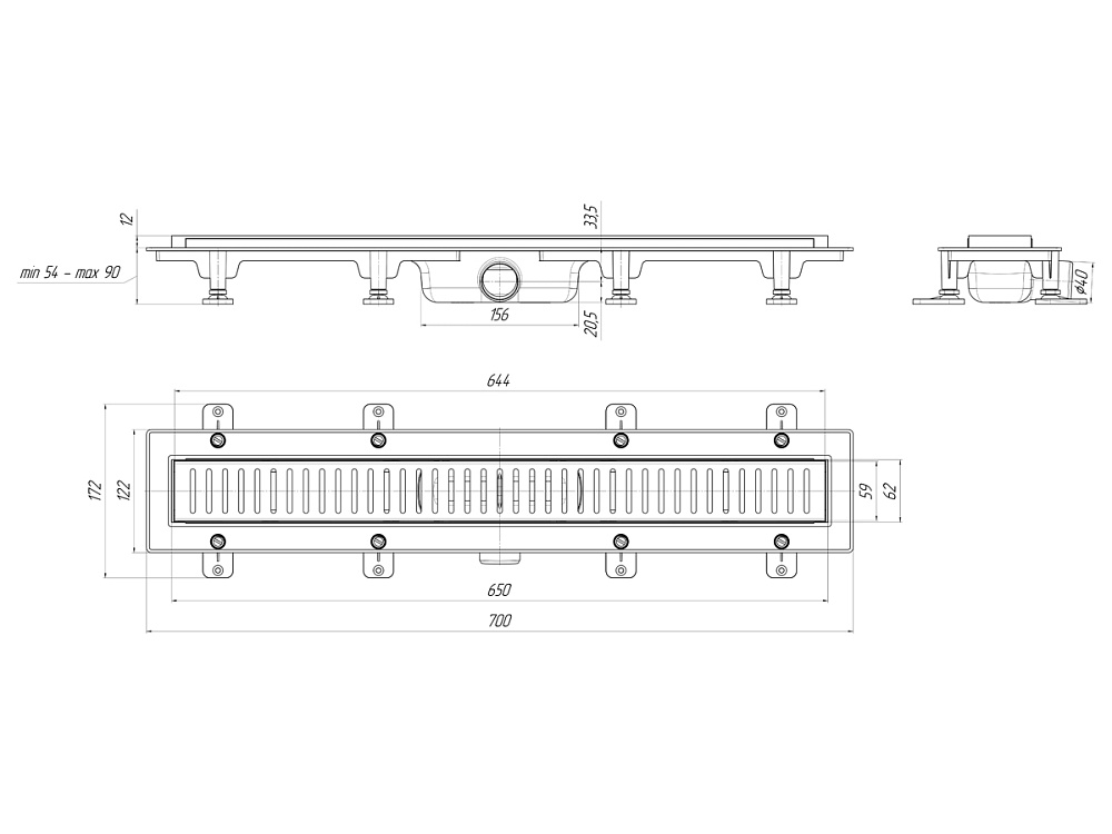 Трап линейный пластиковый АНИ Пласт TL1465M выпуск 40 мм решётка Бимс матовая нержавеющая сталь 650 мм