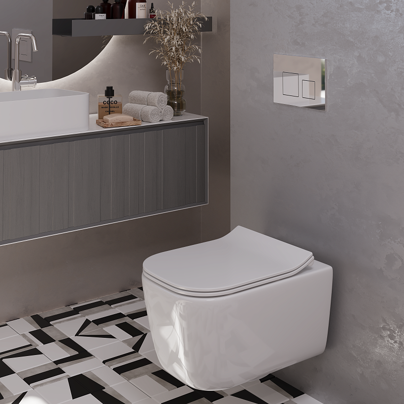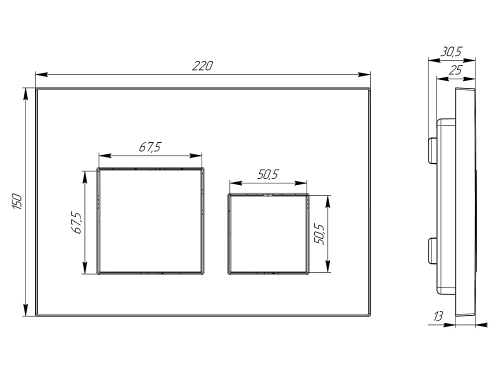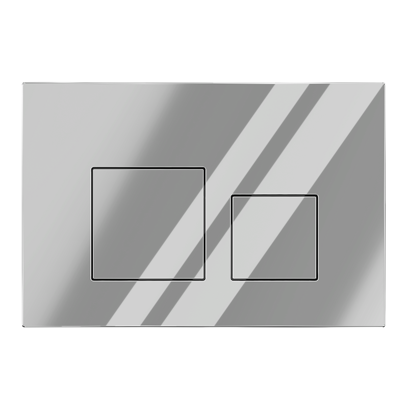 Форма клавиши — строгий прямоугольник с чёткими геометрическими линиями. Такая конфигурация подчёркивает лаконичность и универсальность: панель будет смотреться органично и в компактной, и в просторной ванной. Две отдельные кнопки обеспечивают двухрежимный смыв, что позволяет выбирать между экономичным и стандартным режимом в зависимости от ситуации — это удобно и практично, а также способствует разумному расходу воды.