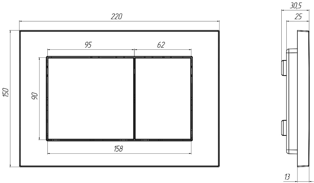 Геометрия клавиши — прямоугольник с чёткими линиями и строгими углами, что подчёркивает её лаконичность и минимализм. Две кнопки обеспечивают систему двухрежимного смыва (обычно 3 л / 6 л), что позволяет рационально расходовать воду: лёгкий смыв задействует меньший объём, а при более интенсивном использовании — полный режим. Это решение важно для экономии ресурсов и соблюдения экологичных стандартов.
