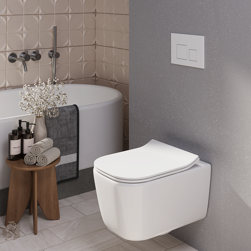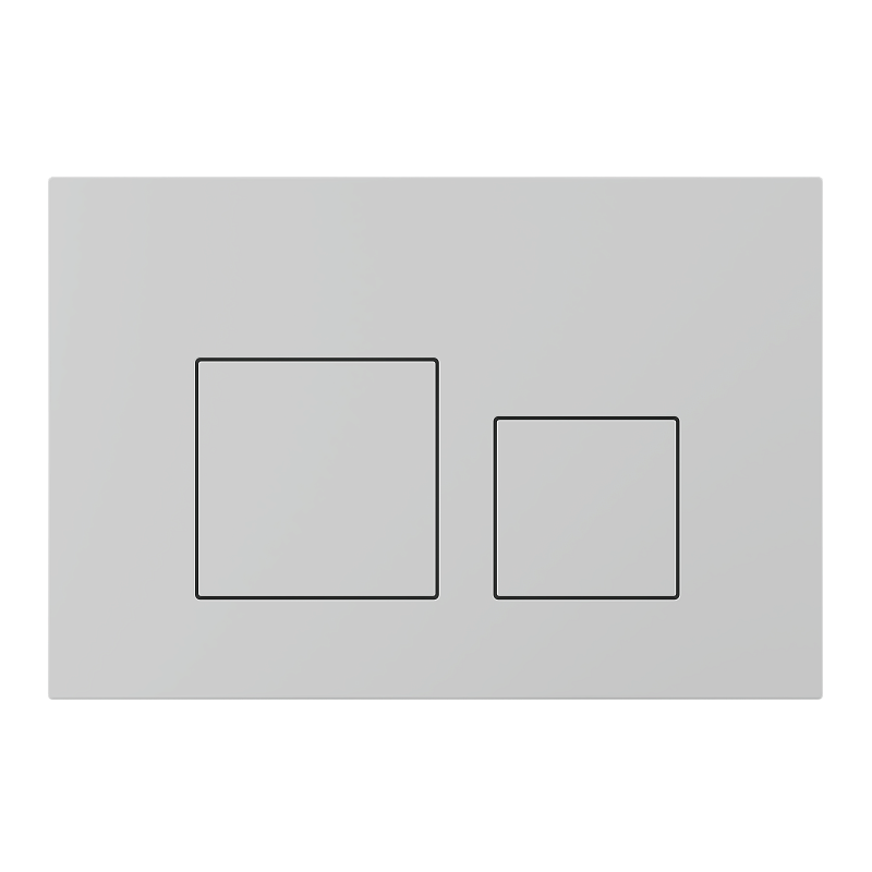 Форма клавиши — строгий прямоугольник с чёткими геометрическими линиями, что подчёркивает её современный характер. Это решение выглядит аккуратно на стене и создает визуальное ощущение порядка и завершённости. Две отдельные клавиши обеспечивают двухрежимный смыв — экономичный и полный, что позволяет гибко управлять расходом воды в зависимости от необходимости и способствует разумному потреблению ресурсов.