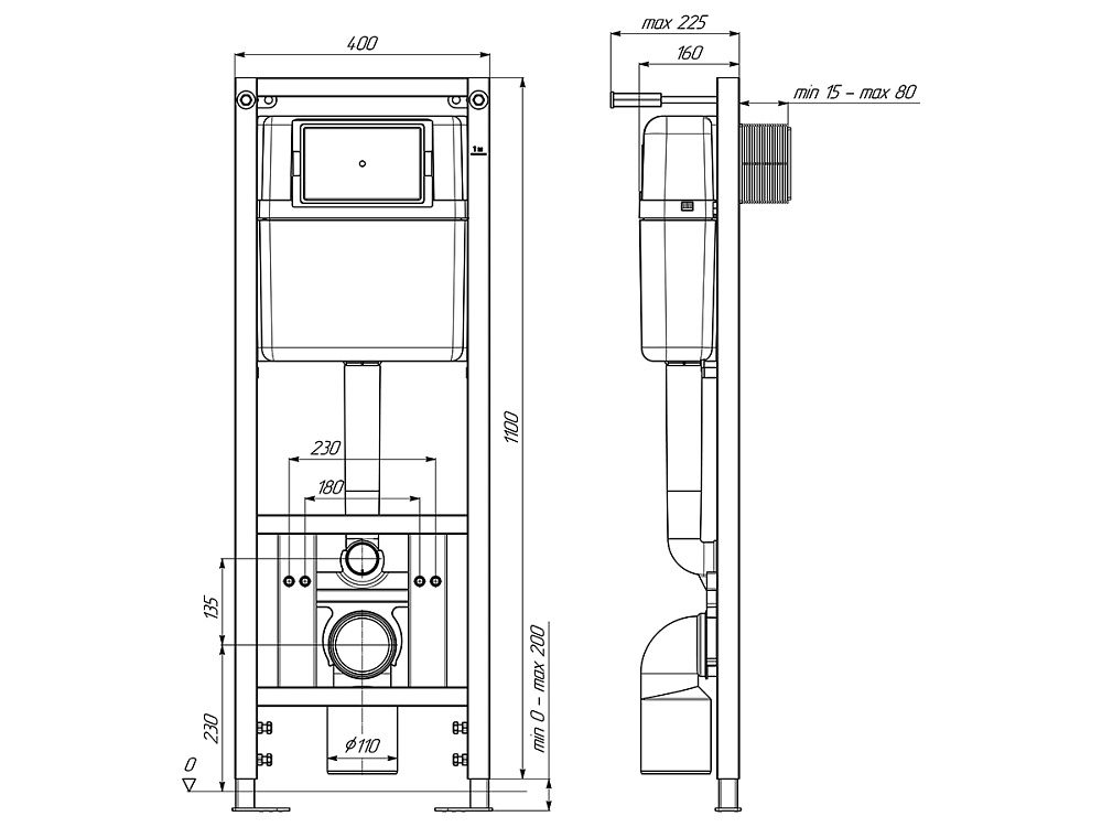 Размеры инсталляции (В х Ш х Г) мм. - 1100–1300 (регулируемая) х 400 х 160-225 (регулируемая).