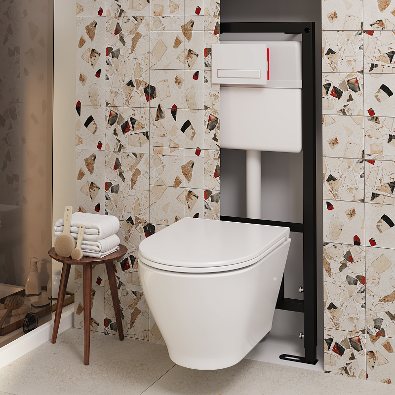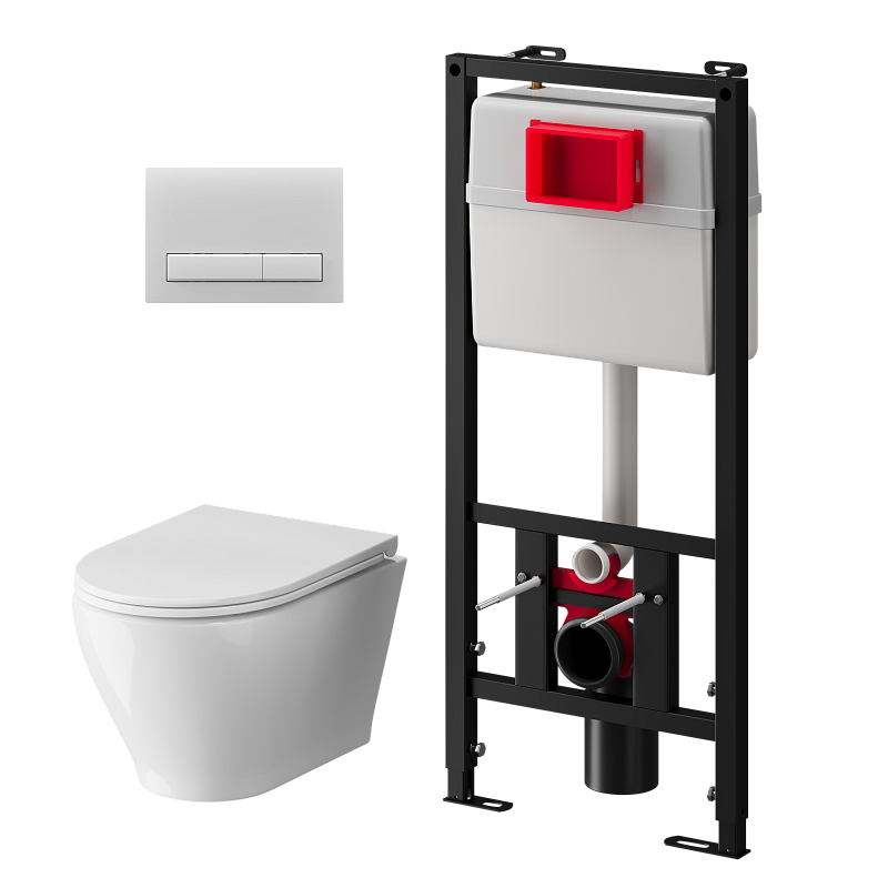 Комплект поставляется полностью укомплектованным: инсталляционная рама, сантехнический бачок, подвесная чаша, сиденье и клавиша смыва — все элементы проверены на совместимость и выполнены в единой цветовой гамме. Это освобождает от необходимости подбирать отдельные компоненты и делает монтаж быстрым и предсказуемым.