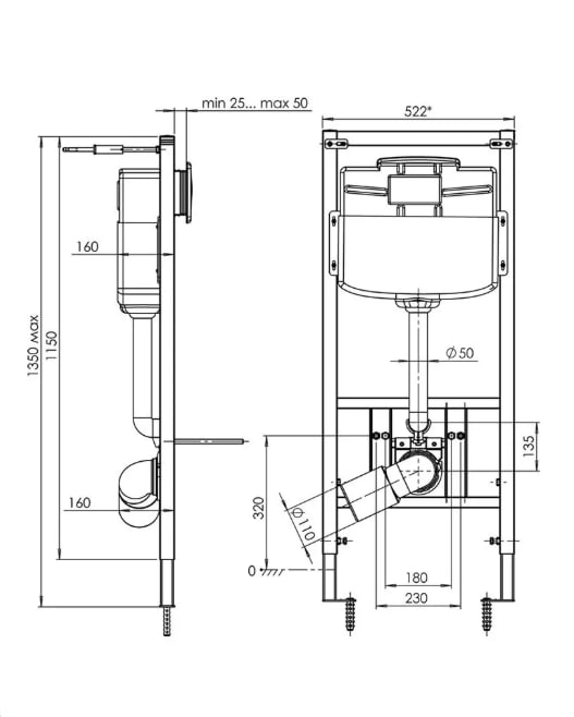 Металлическая рама с крепежом, смывной бачок, клавиша WP1430, переходные трубки, заглушки для труб 50 и 110 мм, картонная упаковка, паспорт с инструкцией. -
