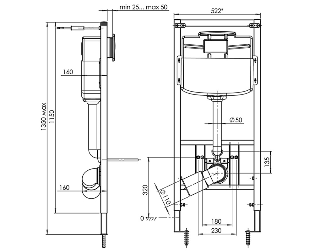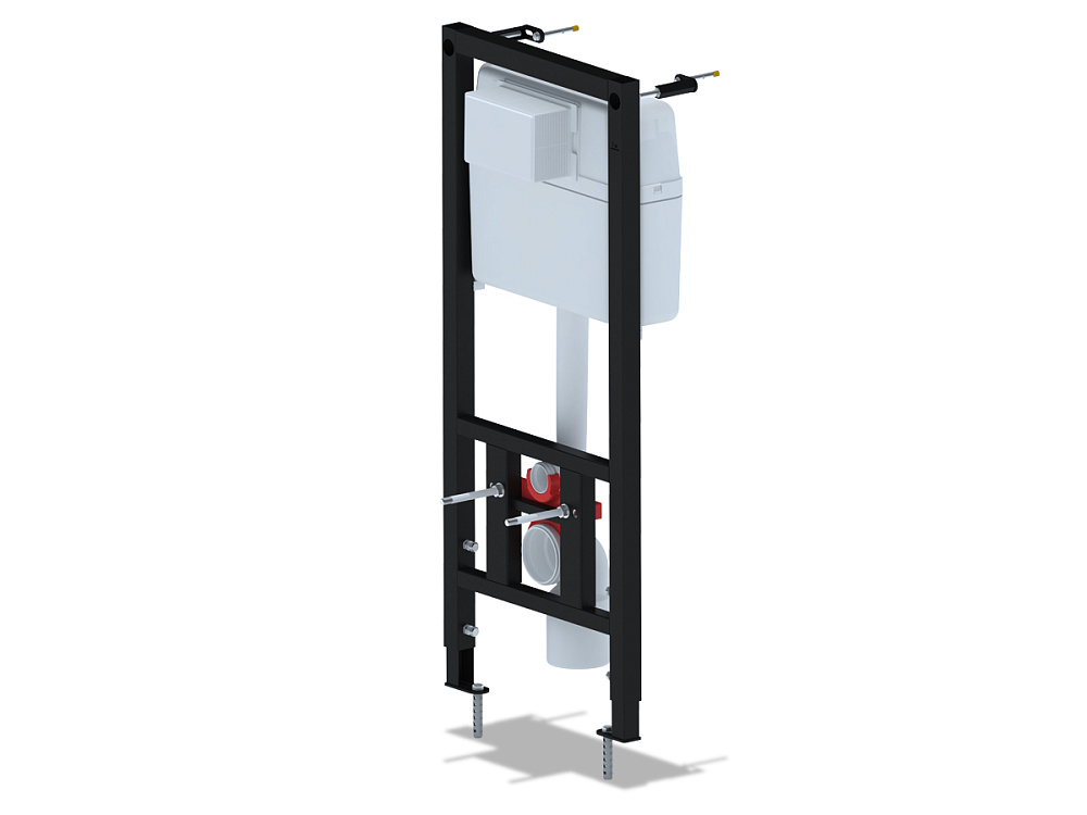 Металлическая рама с крепежом, смывной бачок, клавиша, переходные трубки, заглушки для труб 50 и 110 мм, картонная упаковка, паспорт с инструкцией. -